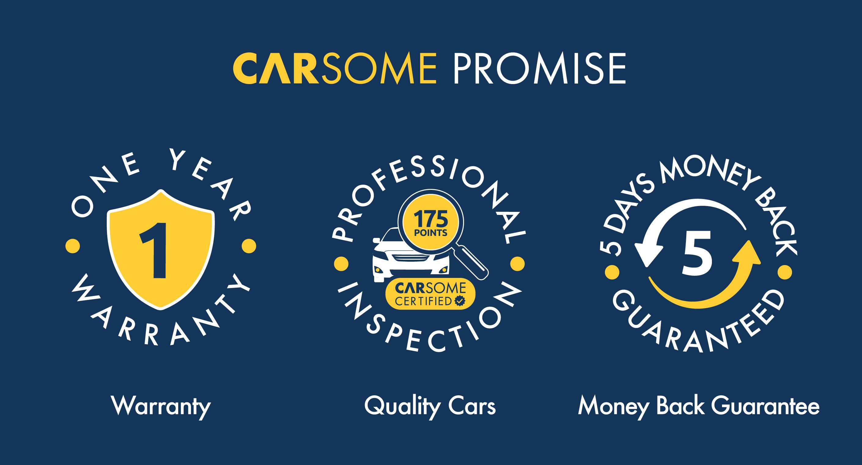 此外,凭着Carsome Promise,买车就变得简单轻松了。不确定这辆车是否适合你?没问题,买了再说,因为我们有5天的退款保证:无需理由、也没有隐藏的费用。
