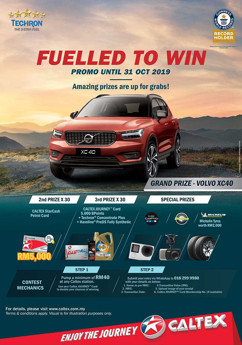 Following from the recent Guinness World Record for the Fastest Ascent of Doi Chang Mountain Road by Car, Caltex has announced a nationwide campaign for Malaysians to experience the fuel that powered a world record. From now until 31st October 2019, customers only need to pump a minimum of RM 40 worth of petrol or diesel in a single receipt at any Caltex, submit their entries via WhatsApp and they can stand a chance to win several prizes including the grand prize of a Volvo XC40, Dashcams, GoPro Cameras and Michelin tyres among others. For more information, visit Caltex ‘Fuelled to Win’ promotional page here.