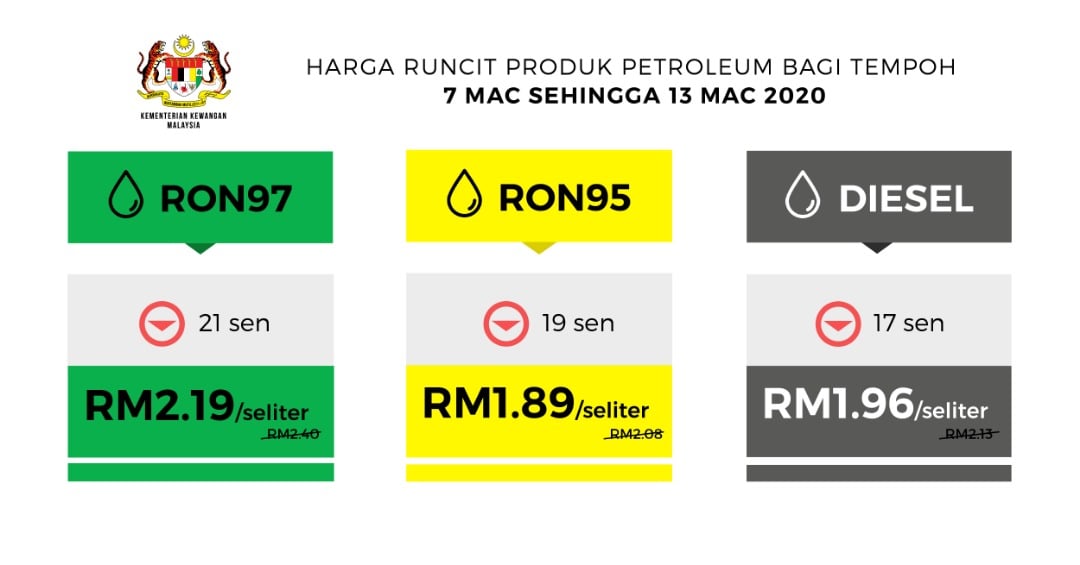 Prices for petrol and diesel from February 29 to March 6, 2020, were priced at RM2.08 for RON-95, RM2.40 for RON-97 and RM2.13 for Euro2M diesel.