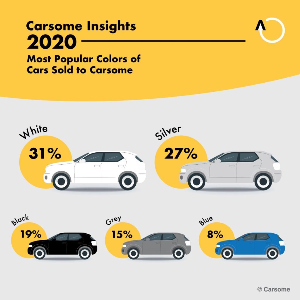 According to our data from Carsome Insights 2020, white cars are the most sold color to Carsome which is at 31%. It is followed by silver (27%), black (19%), gray (15%) and blue cars (8%). If we compare the data between Carsome Insights 2020 and Carsome Insights 2019, these two data show similarities where acromatic colors (white and silver) are the most popular colors sold to Carsome throughout 2019 and 2020.
